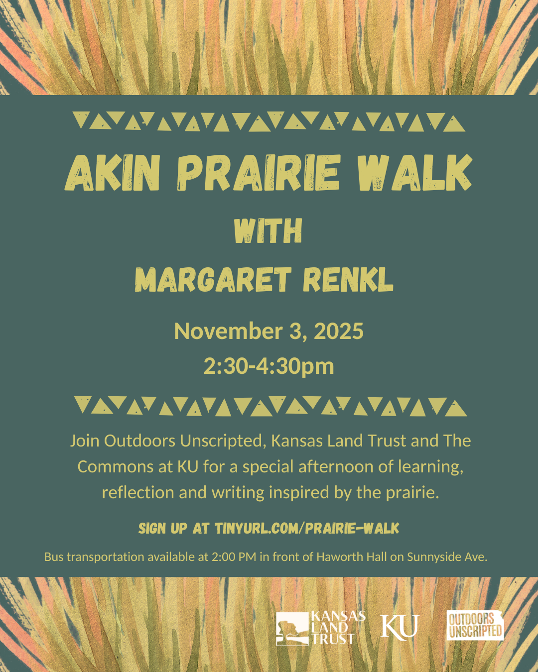 Join Patti Beedles, Conservation Coordinator for the Kansas Land Trust, Andie Perdue, Area Advocate for Lands & Outdoors Unscripted Board Member, and Megan Kaminski, Poet and Professor of Environmental Studies at KU, along with special guest, Margaret Renkl, Author and New York Times columnist, for a special event at Akin Prairie. Attendees will learn about this special place, its important role in our ability to understand prairie ecosystems, and how it is cared for. Inspired by Margaret Renkl’s work, attendees will have a chance to participate in their own writing/response practice in collaboration with the Prairie. The event will close with a unique opportunity to hear Megan Kaminski read her poetry in the place that co-created it.